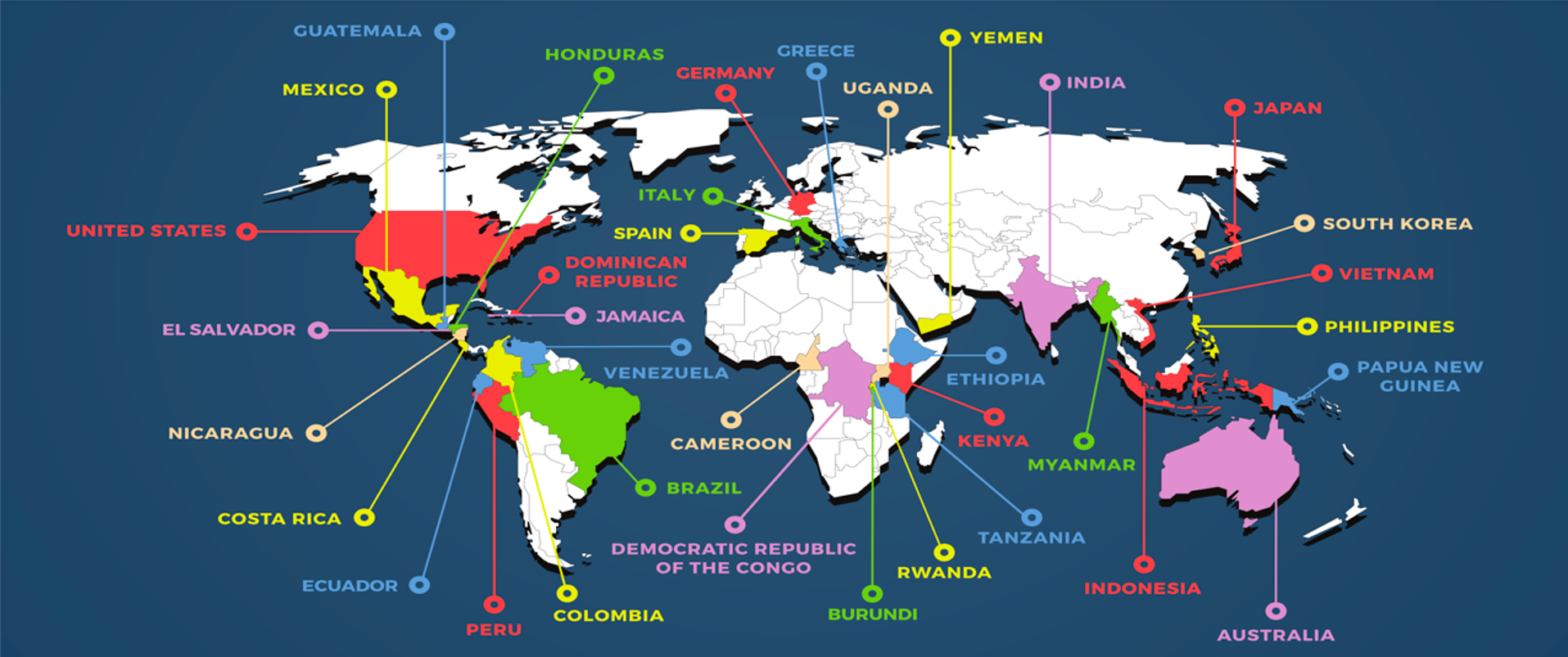 Cada punto en este mapa representa un capítulo activo de IWCA, conformado por mujeres que trabajan en origen, procesamiento, comercialización, investigación, tueste y consumo, unidas por un propósito común: generar equidad, oportunidades y sostenibilidad en la industria del café.